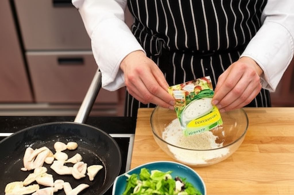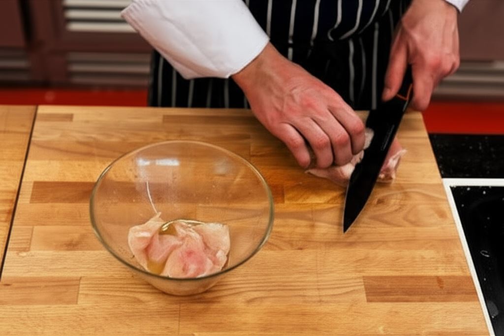 W pozostałej marynacie umieść pocięte w paski piersi kurczaka. Mięso trzymaj w niej przez około 15 minut. Następnie usmaż je do złotego koloru.