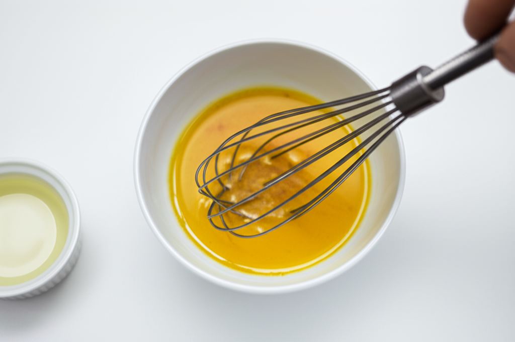 Sos sałatkowy Knorr połącz w miseczce z 3 łyżkami wody i 3 łyżkami oliwy.