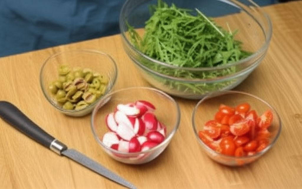 Opłucz warzywa. Pomidorki i rzodkiewkę podziel na ćwiartki, oliwki odsącz i przekrój na połówki.
