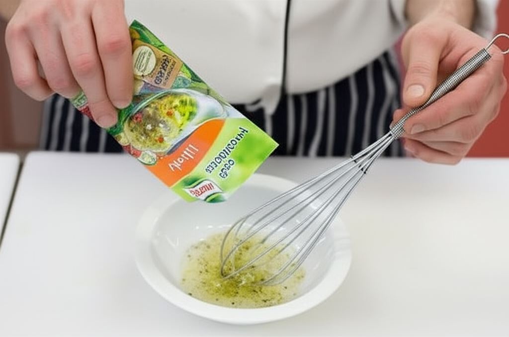 Sos Knorr połącz z 3 łyżkami wody oraz 3 łyżkami oliwy z oliwek. Wsyp uprażone pestki słonecznika.