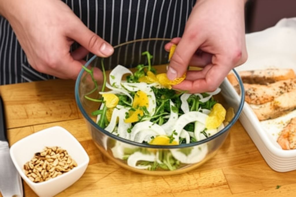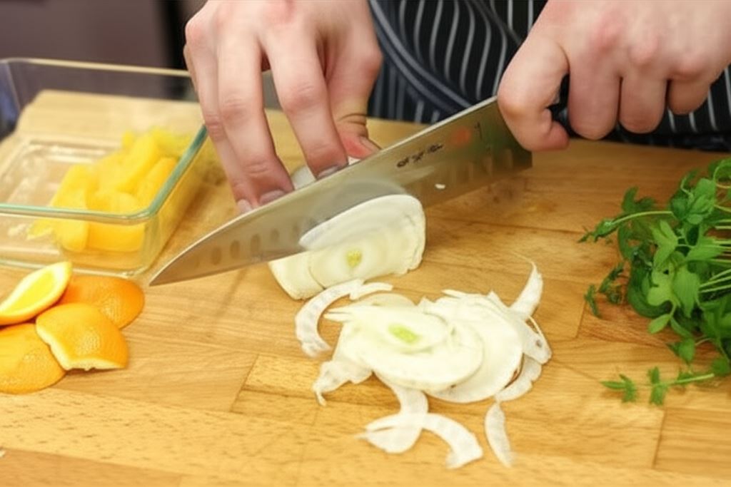 Wytnij segmenty z pomarańczy, posiekaj natkę lubczyku, fenkel pokrój na cienkie plastry.
