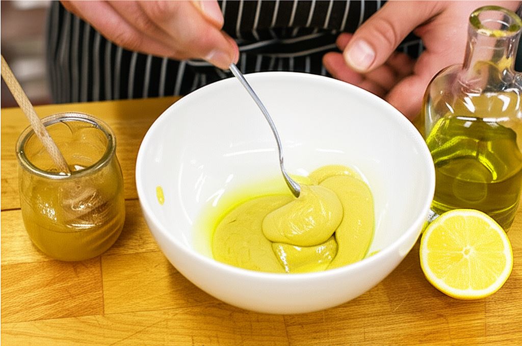 W misce wymieszaj musztardę, sok z cytryny, miód, ocet jabłkowy, oliwę. Przygotowanym sosem polej obficie sałatkę od góry.