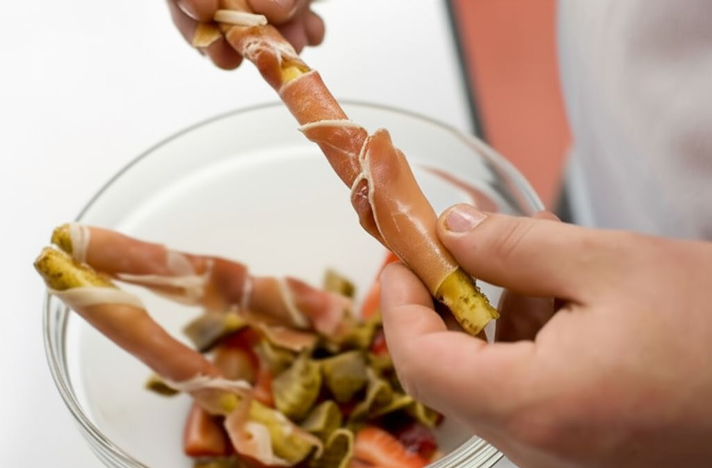 Truskawki podziel na ćwiartki, figi na cztery części. W każdy z plastrów cienko pociętej szynki zawiń po 1 sztuce grissini.