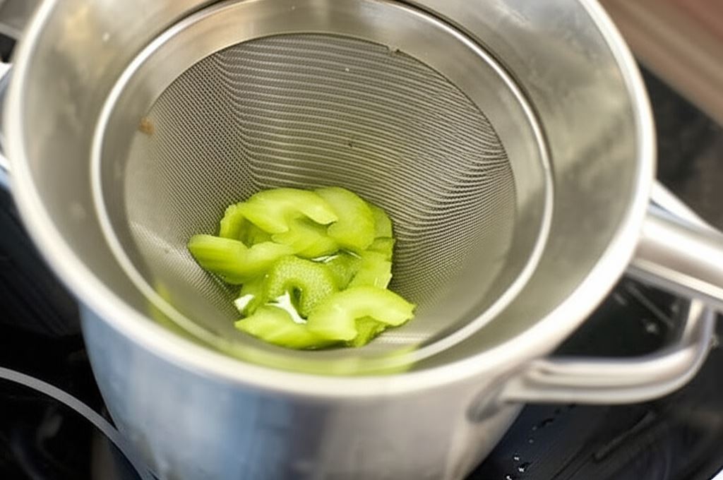 Łodygi selera oczyść z włókien, potnij na małe kawałki ukośnie i blanszuj krótko w gotującej się wodzie – schłodź w lodzie.