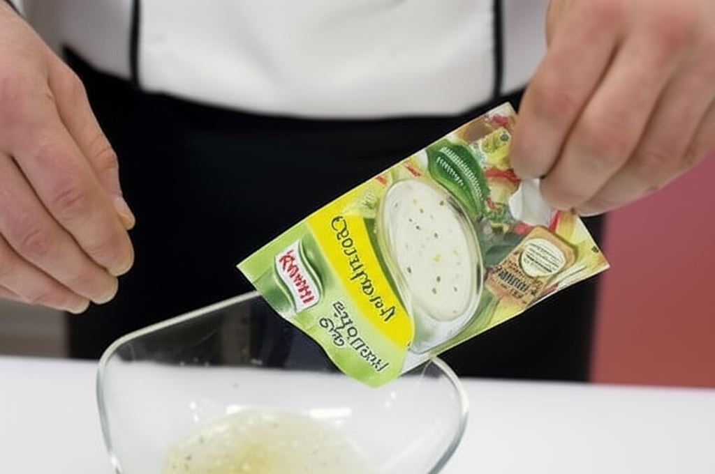 Sos Knorr połącz z 3 łyżkami wody, majonezem i drobno posiekaną natką.