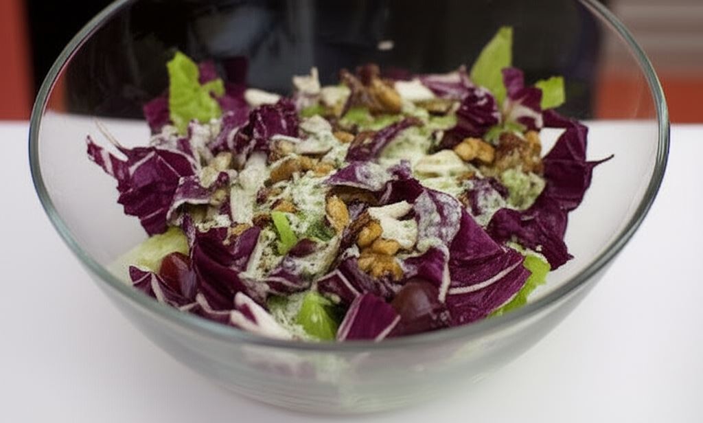 Odkryj wyjątkową kompozycję smaków w tej eleganckiej sałatce! Chrupiący seler naciowy, delikatnie zblanszowany dla zachowania świeżości, spotyka się z lekko gorzkawą sałatą radicchio, której fioletowa barwa nadaje potrawie wyrazisty charakter. Słodkie winogrona wprowadzają owocową nutę, a prażone orzechy włoskie dodają przyjemnej tekstury. Całość dopełnia kremowy sos czosnkowy i wyrazisty ser pleśniowy, tworząc harmonijne połączenie, które zachwyci każde podniebienie.