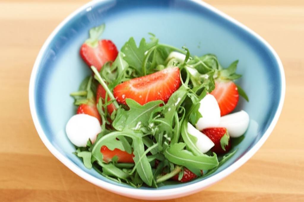 Rukola, będąca bazą tej sałatki, najlepiej smakuje, gdy jest świeża – nawet lekko zwiędnięta staje się nieprzyjemnie gorzka. Jej wyrazisty, lekko orzechowy smak stanowi doskonałe tło dla słodko-kwaśnych truskawek i łagodnej mozzarelli.