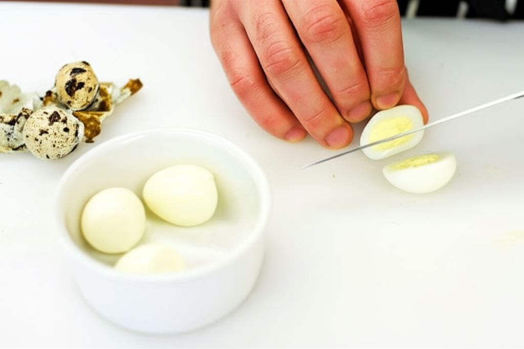 Jajka przepiórcze ugotuj na twardo przez 3 minuty, ostudź, obierz ze skorupek i przekrój na połówki.