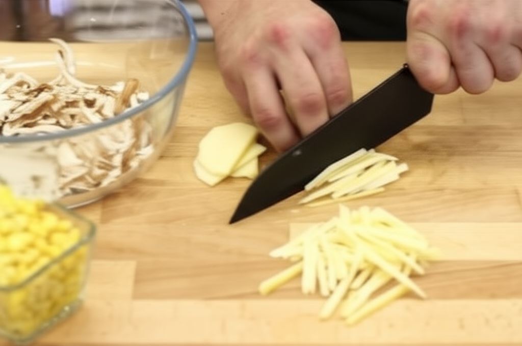 Pierś kurczaka pokrój na nitki, a wędzony ser i pora potnij w paski. Kukurydzę odcedź z zalewy.
