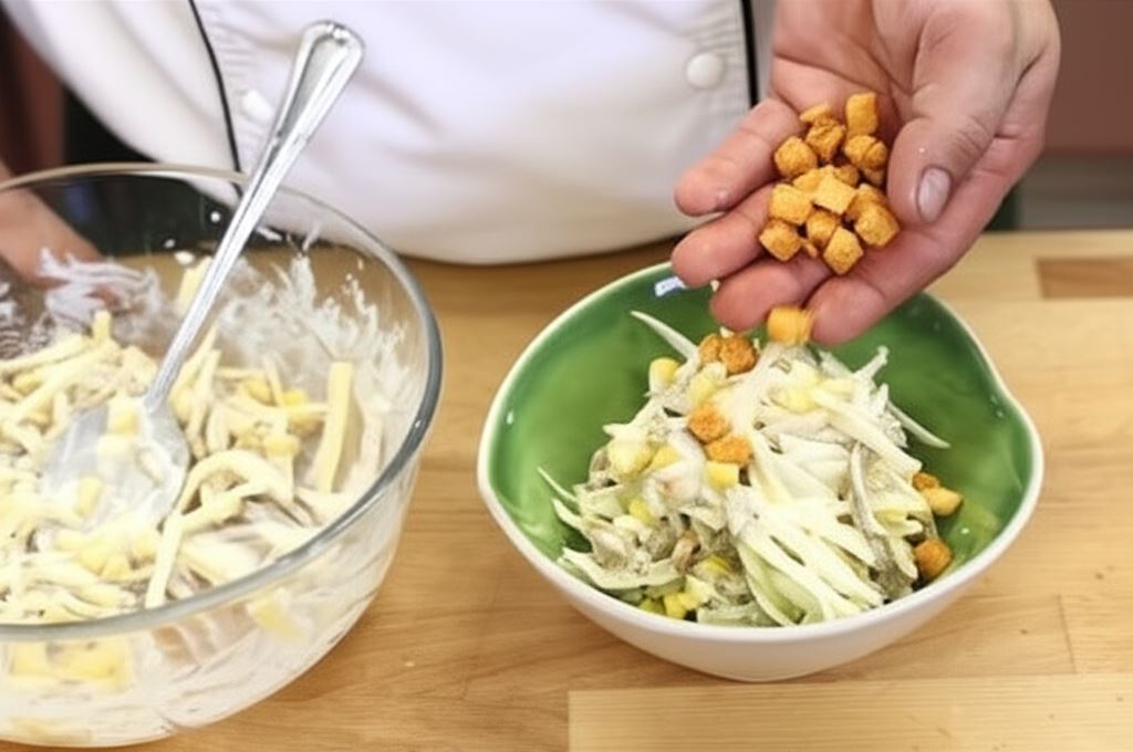 Serwuj sałatkę oprószoną grzankami.