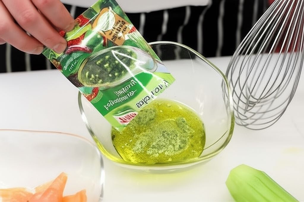 Sos sałatkowy koperkowo-ziołowy Knorr przygotuj zgodnie z instrukcją na opakowaniu łącząc go z wodą i oliwą.