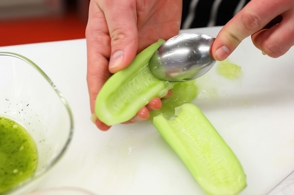 Łososia potnij w paski. Ogórka obierz ze skóry, przekrój wzdłuż na połowę i łyżeczką usuń pestki. Oczyszczonego ogórka pokrój w poprzek w półplasterki, które kształtem będą przypominać literę C.