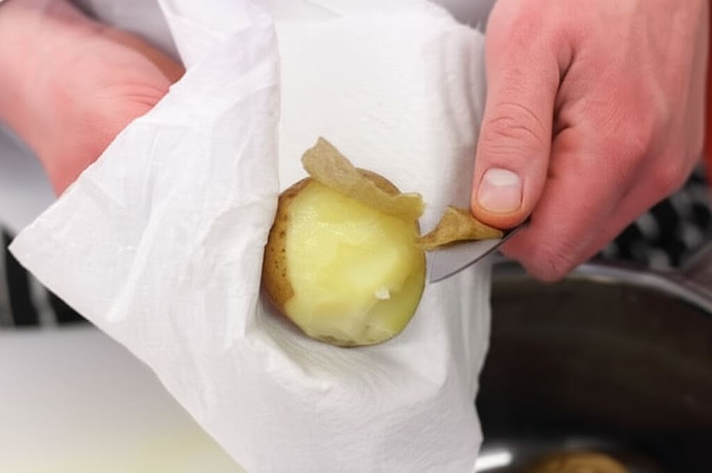 Ugotowane ziemniaki, gdy są jeszcze ciepłe, obierz, trzymając je w dłoni przez ściereczkę.