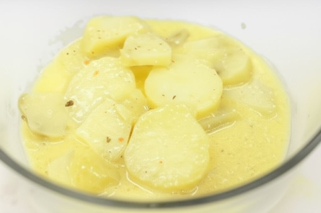 Potem pokrój na plastry i wciąż ciepłe przesyp do naczynia z sosem. Starannie zamieszaj i daj czas, aby gorące ziemniaki zaabsorbowały sos.