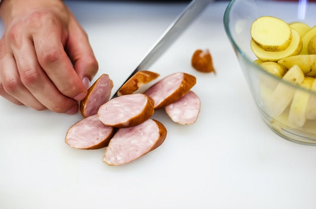 Ziemniaki starannie opłucz i potnij na grube krążki. W podobny sposób pokrój kiełbasę.