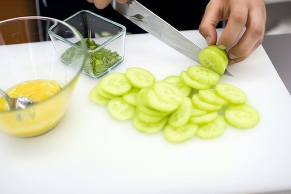 Musztardę połącz starannie z oliwą. Ogórka obierz i potnij na plasterki, a natkę pietruszki drobno posiekaj.