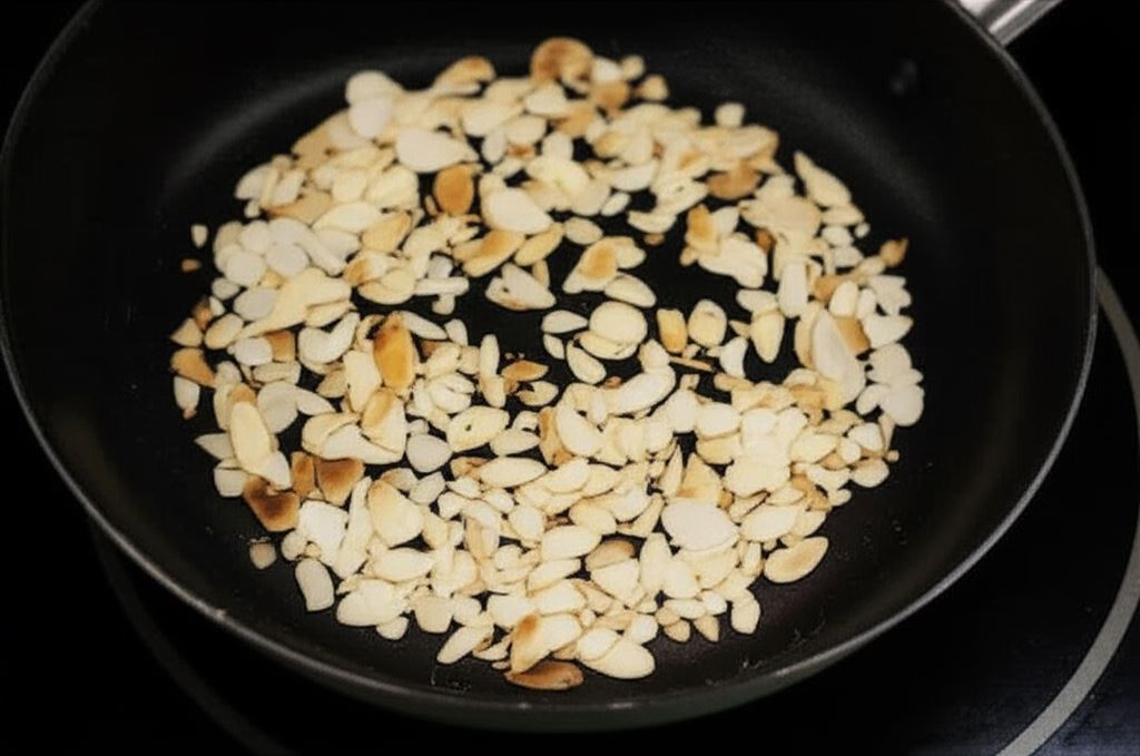 Migdałowe płatki podpraż na suchej patelni. Gdy uzyskają złoty kolor, odłóż je do wystygnięcia.