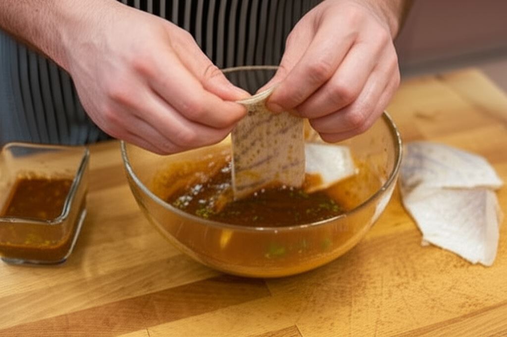 Delikatne mięso sandacza zyskuje nowy, orientalny wymiar dzięki aromatycznej glazurze imbirowej. Ta wyjątkowa kompozycja słodko-pikantnych smaków sprawia, że ryba nabiera wyrazistego charakteru, zachowując jednocześnie swoją naturalną delikatność. Glazura z ketchupu Hellmann’s, sosu sojowego, imbiru, miodu i oleju sezamowego tworzy harmonijną równowagę między słodyczą a pikantną nutą.