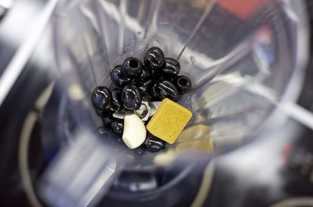 Do oliwek dodaj czosnek oraz kostkę rosołową Knorr. Wszystko dokładnie zblenduj, aż uzyskasz gęstą, czarną masę.