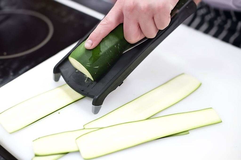Odetnij końcówki cukinii. Potem pokrój ją wzdłużnie na cienkie plastry.
