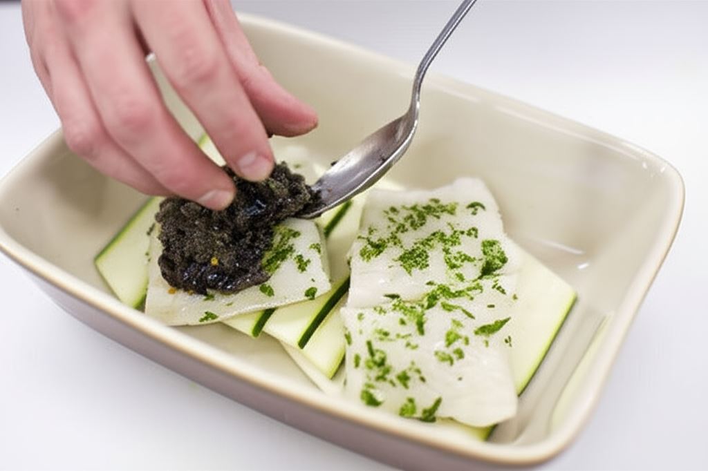 Delikatne mięso sandacza w połączeniu z intensywną tapenadą oliwkową tworzy harmonijne połączenie smaków, które zachwyci nawet wybredne podniebienia. Ta elegancka kompozycja opiera się na kontrastach – jasne mięso ryby pięknie komponuje się z czarną pastą z oliwek, a neutralny smak cukinii stanowi idealne tło dla wyrazistych dodatków.