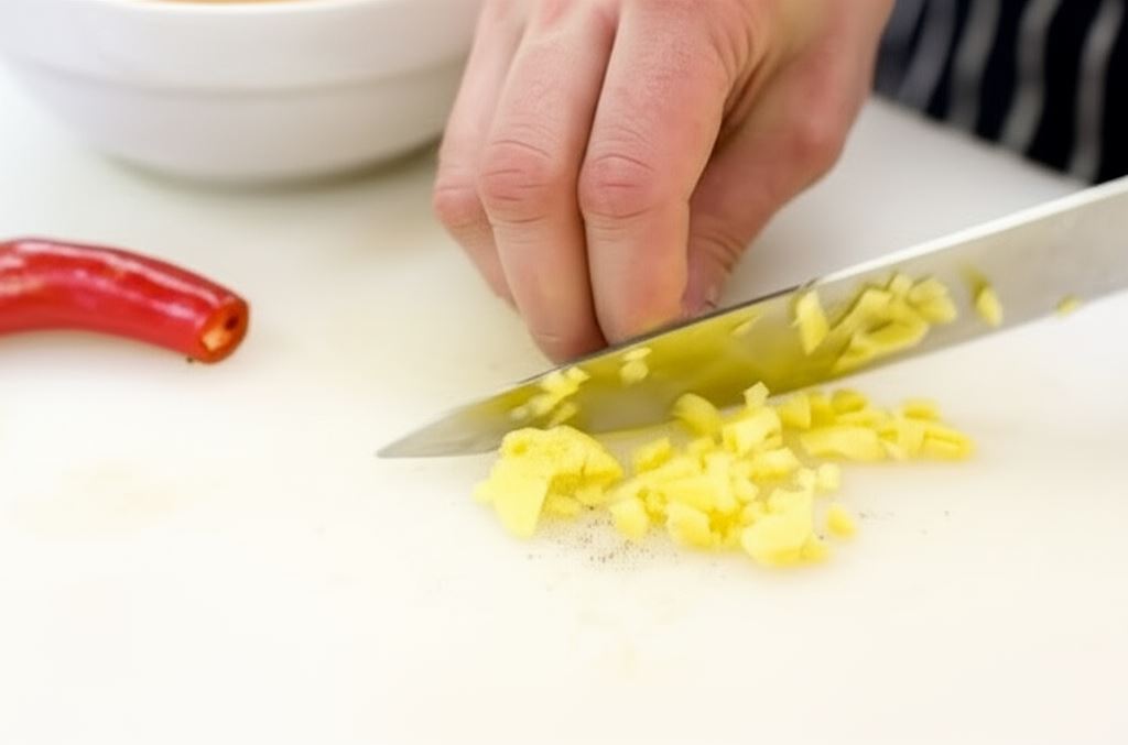 Wsyp drobno posiekaną papryczkę chilli i imbir. Potem doprowadź sos do wrzenia.