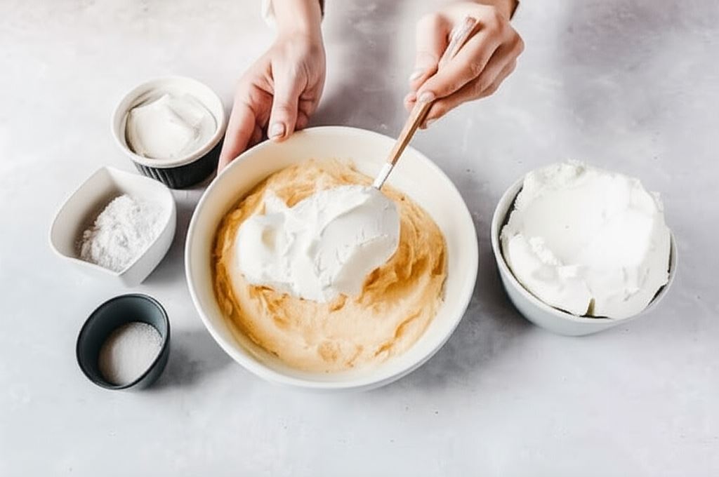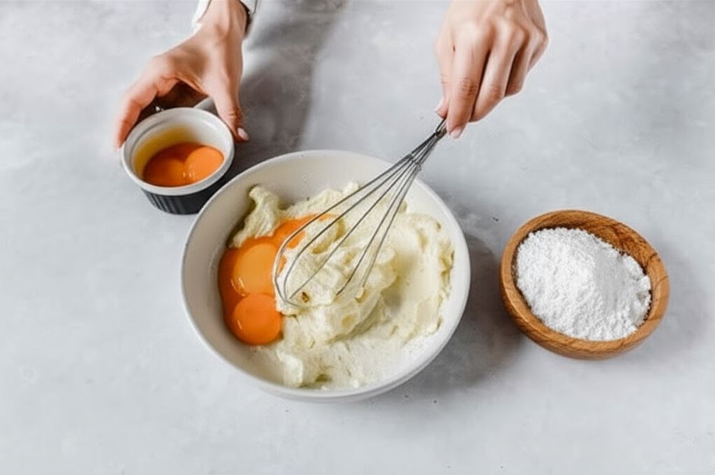 Do uzyskanej masy wsypujemy cukier waniliowy, mąkę ziemniaczaną i dodajemy śmietankę. Mieszamy nieprzerwanie, aż składniki się połączą.