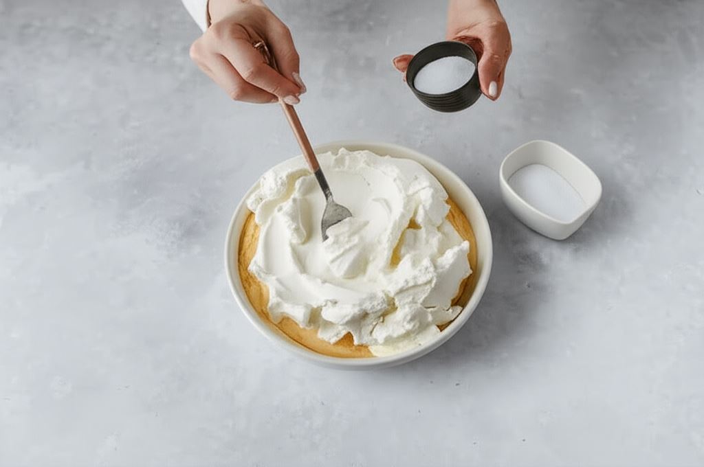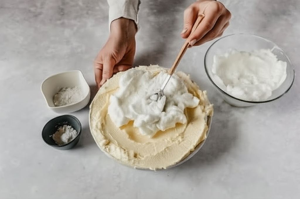 Białka ubijamy na sztywno. Wsypujemy do masy serowej. Ostrożnie mieszamy, niezbyt długo, by masa nie została napowietrzona.