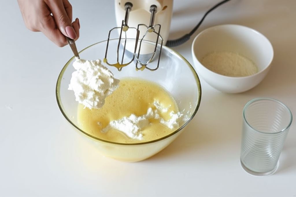 Dodawaj stopniowo, łyżka za łyżką ser twarogowy cały czas miksując. Wsyp także wiórki kokosowe. Miksuj do połączenia wszystkich składników.