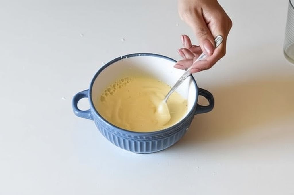 Budynie łączymy z mlekiem w miseczce. Wsypujemy go do sernika. Jeszcze raz miksujemy.