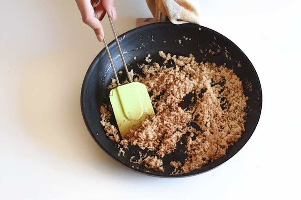 Na patelni rozpuszczamy masło. Dodajemy 5 łyżek wiórków kokosowych i cukier. Dolewamy wodę. Smażymy na średnim ogniu aż uzyskają złoty kolor.
