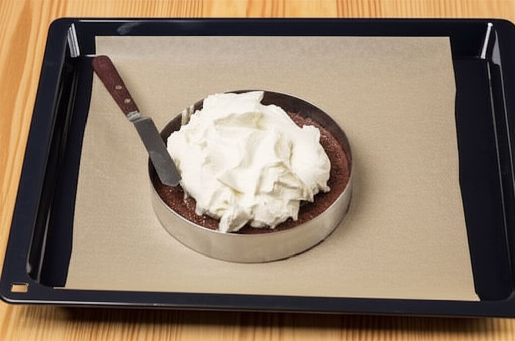 Rozprowadź krem na wcześniej przygotowanej tortownicy. Gotowy wypiek przyozdób ciasteczkami oreo.