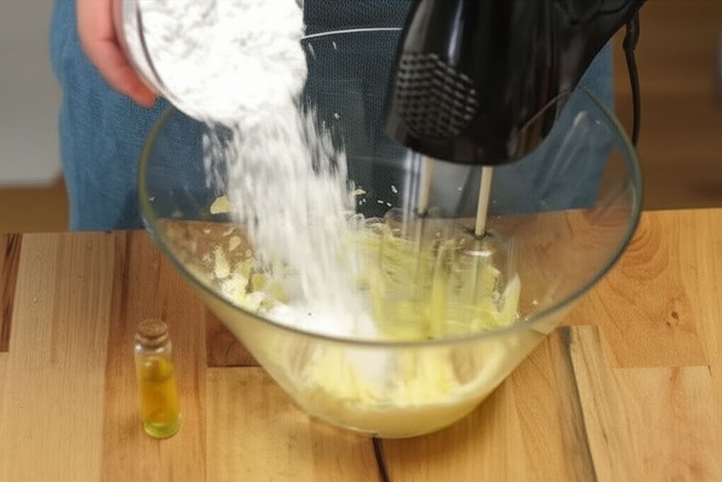 Masę ostrożnie połącz z ubitymi białkami, wsyp proszek do pieczenia i zamieszaj.