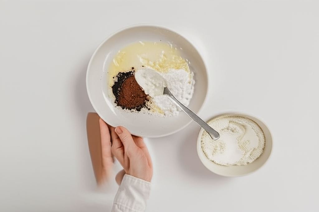 Masło topimy w rondelku i zostawiamy do ostygnięcia. Przelewamy do miski. Wsypujemy cukier puder, kakao i mąkę pszenną. Wszystko wyrabiamy na kruszonkę.