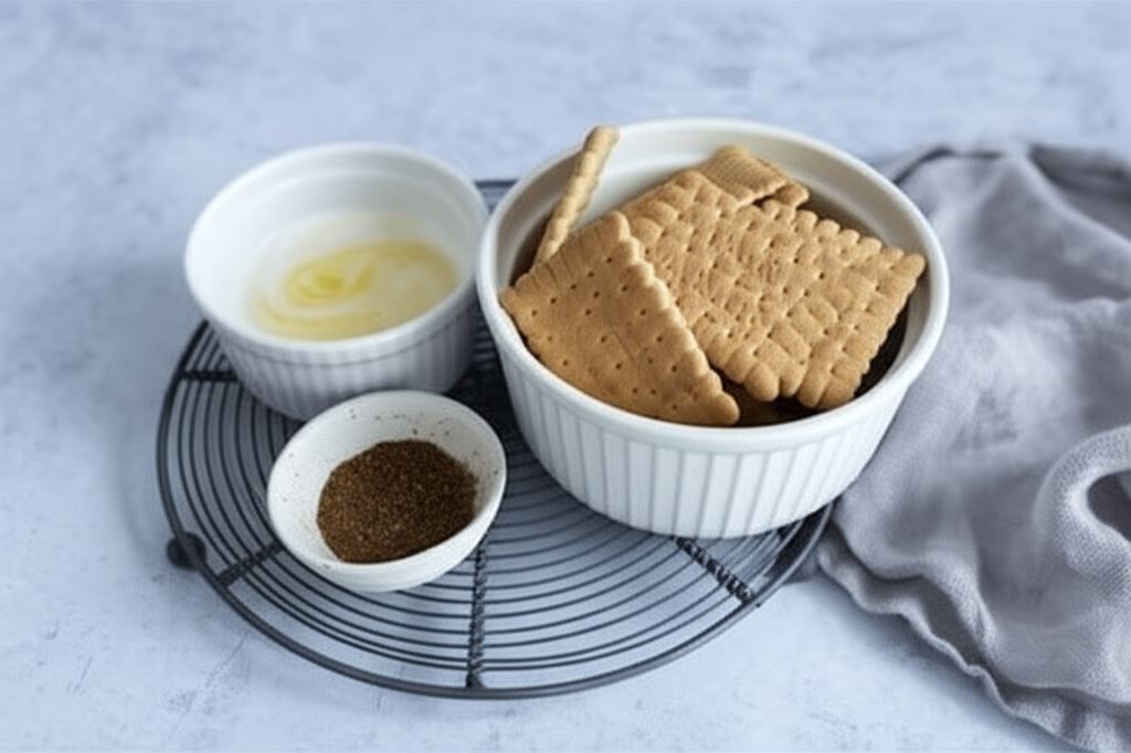 Sporządź spód. Roztop masło. Herbatniki rozdrobnij blenderem z przyprawą korzenną i wymieszaj z masłem.