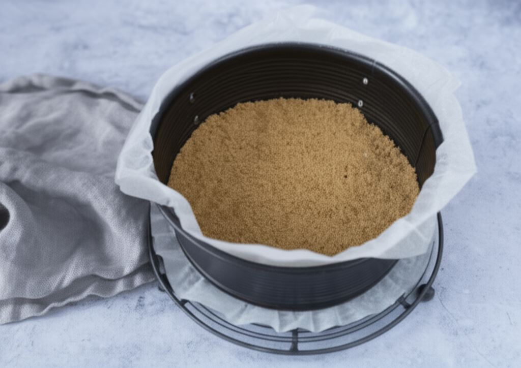 Umieść na dnie tortownicy, wyłożonej papierem do pieczenia i wstaw do lodówki podczas przygotowywania masy serowej i makowej.
