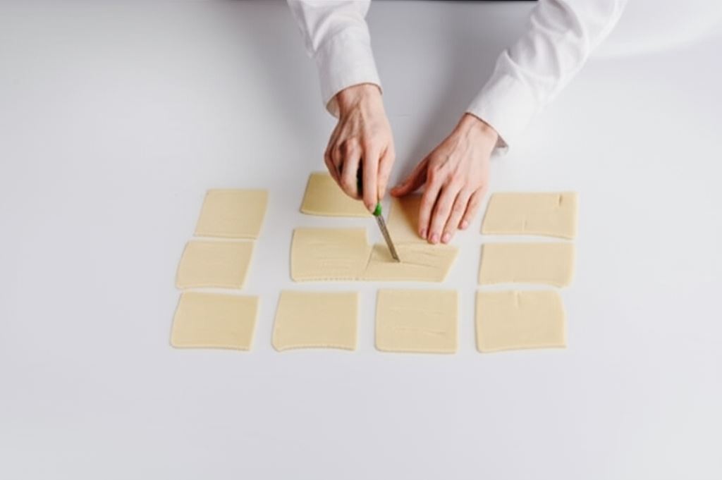 Ciasto wałkujemy i tniemy na 16 prostokątów (ok. 8 x 10 cm). 8 prostokątów przecinamy w dwóch miejscach przez środek.