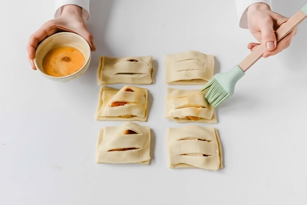 Krawędzie smarujemy roztrzepanym jajkiem i łączymy z naciętymi fragmentami.