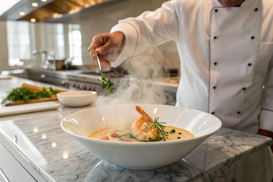 Premium restauracje w 2025 roku stosują innowacyjne techniki serwowania zupy krem z krewetkami. Popularne stało się podawanie zupy w dwóch teksturach – aksamitny krem na dnie talerza, a na wierzchu lekka, napowietrzona pianka o intensywnym smaku krewetek. Innym trendem jest serwowanie w szklanych kielichach z dodatkami umieszczonymi warstwowo, co tworzy efektowną prezentację.