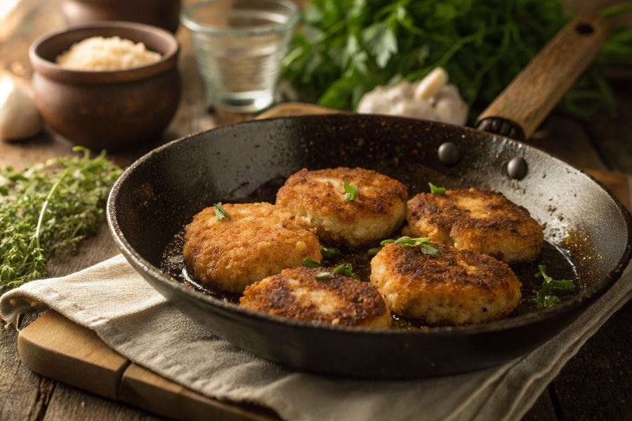 Smaż kotleciki po 3-4 minuty z każdej strony, aż uzyskają złocistobrązowy kolor. Nie przepełniaj patelni – zbyt wiele kotlecików naraz obniży temperaturę oleju, przez co staną się tłuste zamiast chrupiące.