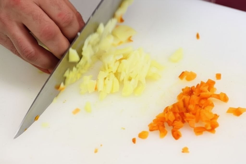 Ziemniaki i marchew ugotuj aż będą miękkie. Potem ostudź i posiekaj w małą kostkę.