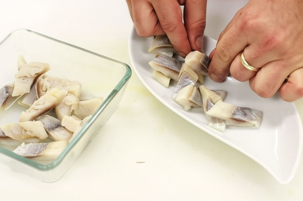 Na szklanym półmisku lub w misce na spodzie umieszczaj śledzie pocięte na mniejsze kawałki.