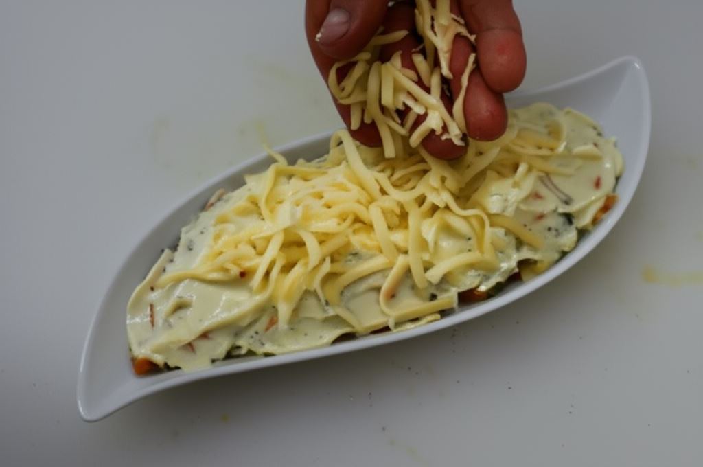 Na wierzchu rozsyp starty ser żółty i przyozdób listkami pietruszki.