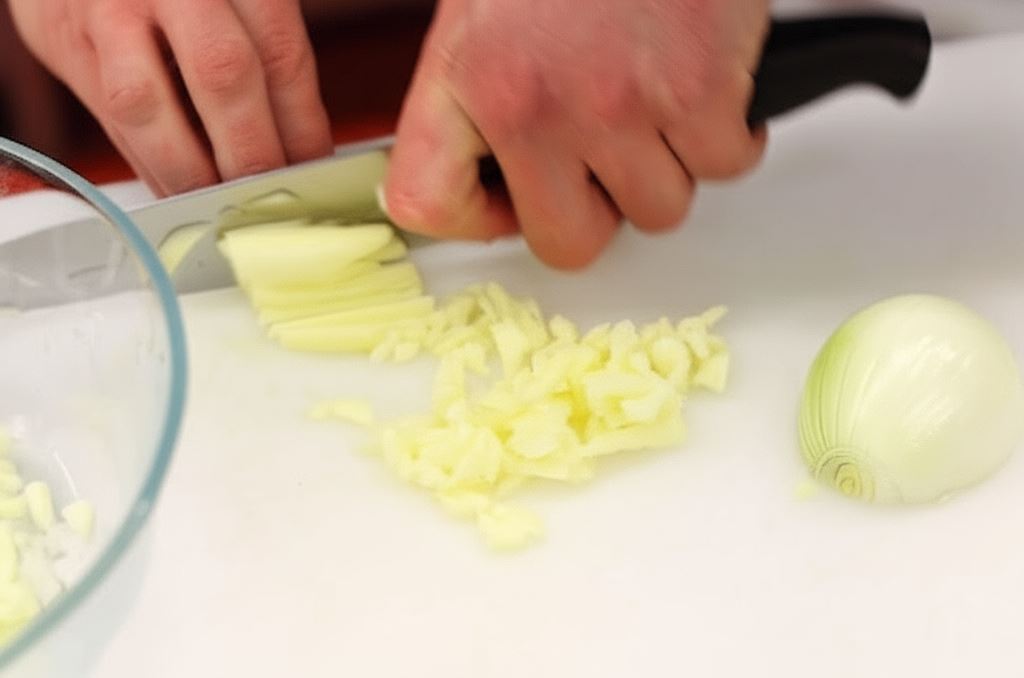 Cebulę oraz obrane jabłko posiekaj na drobną kosteczkę.