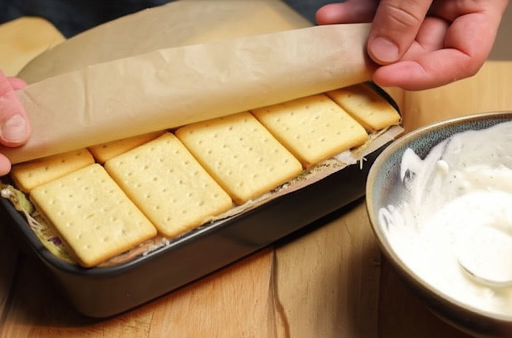 Całość ponownie lekko posmaruj sosem i ułóż następną warstwę krakersów. Na krakersy połóż pergamin, deskę i postaraj się przycisnąć wszystkie składniki, aby wycisnąć nadmiar soku – odlej go.