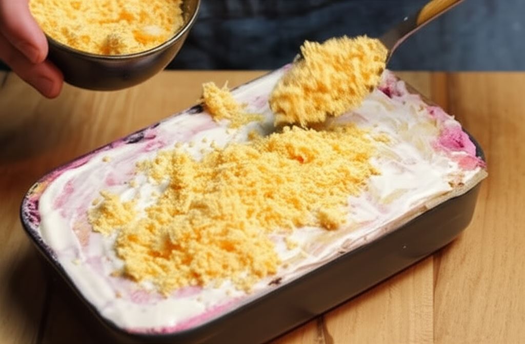 Zdejmij pergamin, a krakersy posmaruj końcową warstwą sosu i posyp z góry startym żółtkiem. Sałatkę umieść w lodówce przez całą noc. Kolejnego dnia pokrój ją, niczym ciasto, na porcje i rozłóż na półmisku.