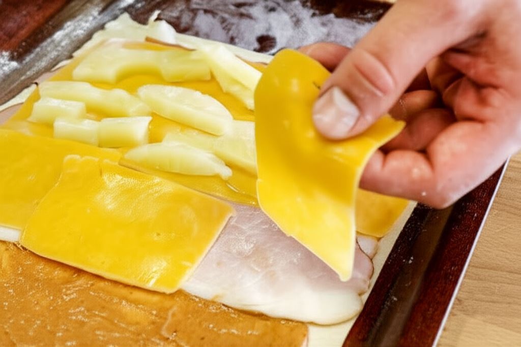Posmaruj ciasta francuskie sosem, a następnie ułóż plasterki szynki, sera oraz ananasa.