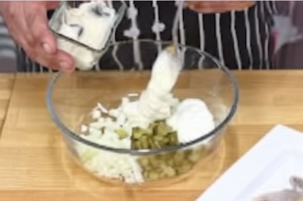 Jabłko, ogórka i cebulę posiekaj w małą kostkę. Połącz z majonezem Hellmann's oraz śmietaną.