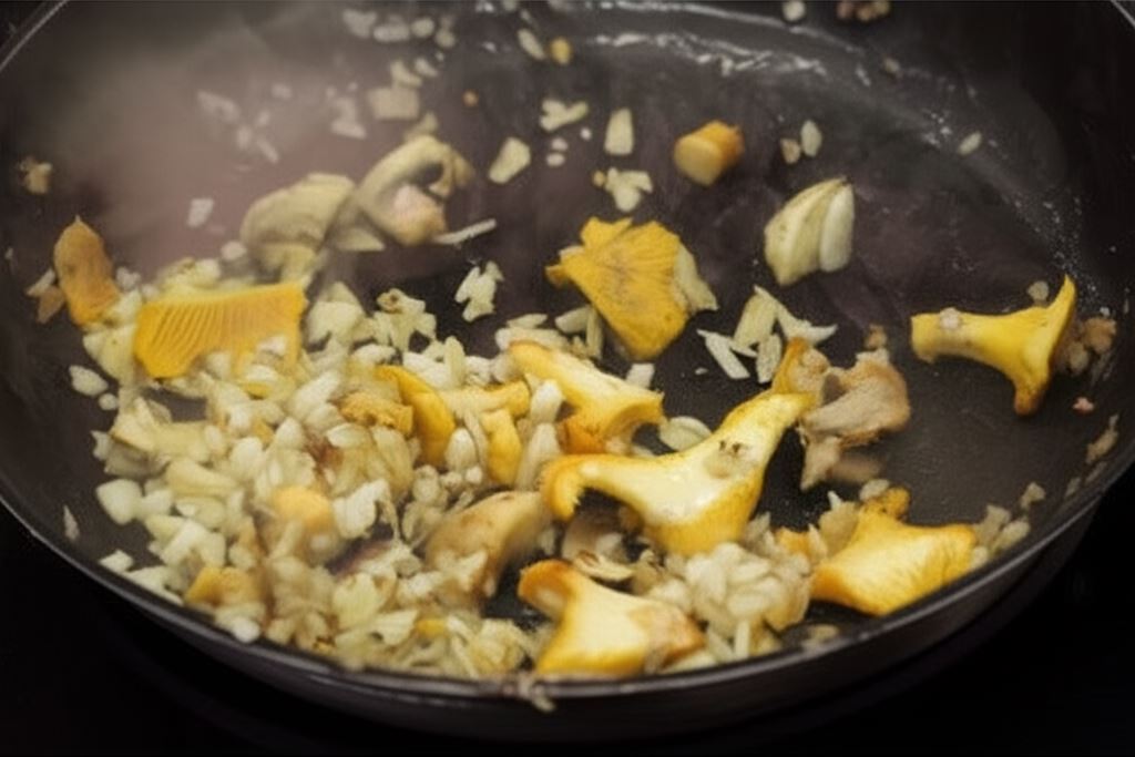 Na patelni zeszklij cebulę i czosnek, dodaj grzyby, smaż moment mieszając co jakiś czas, na patelni nie powinno zostać żadnego płynu.