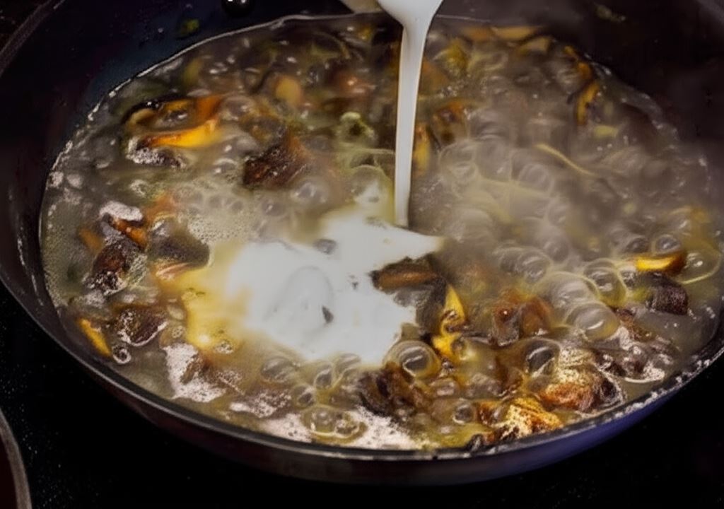 Wsyp wtedy łyżkę mąki i starannie wymieszaj z grzybami. Grzyby zalej szklanką wody, dodaj śmietanę, całość gotuj przez pięć minut mieszając od czasu do czasu, aż sos zgęstnieje.